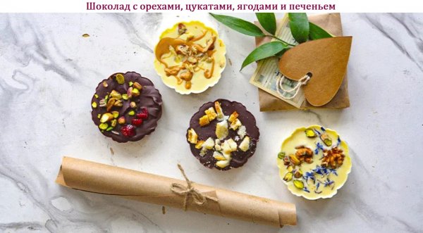 Описание: 🥣 Шоколад с орехами, цукатами, ягодами и печеньем✅ Нужно (на 6 порций)⇨ Шоколад тёмный (60% какао) – 180 г⇨ Шоколад молочный – 180 г⇨ Шоколад белый – 180 г⇨ Грецкий орех – 60 г⇨ Фисташки – 50 г⇨ Лаванда сушёная – по вкусу⇨ Ирис конфеты – 4 шт.⇨ Печенье бисквитное – 2 шт.⇨ Цукаты из апельсина – 20 г⇨ Ягоды сушёные – 1 ст.л.✅ Готовка◆ – Подготовьте продукты для оформления шоколада. Грецкие орехи подсушите на сковороде без масла, остудите и порубите.◆ – Ириски поместите на водяную баню с растопите. Сохраняйте массу в полужидком состоянии.◆ Бисквитное печенье наломайте небольшими кусочками. Цукаты можно измельчить или оставить крупными.◆ – Фисташки порубите. 30 г фисташек соедините с сушёными ягодами. Для этого варианта хорошо подходят сублимированная клубника или малина, сушёная вишня или черника.◆ – Наломайте белый, молочный и тёмный шоколад небольшими кусочками. По отдельности сложите каждый вид шоколада в небольшие миски и растопите на водяной бане или в микроволновой печи. Растапливайте шоколад, постоянно перемешивая силиконовой лопаткой. Разложите шоколад в 6 силиконовых форм и разровняйте поверхность лопаткой.◆ – Пока шоколад не застыл, украсьте каждую плитку по вашему выбору. Добавьте в формочку с мягкой шоколадной массой 20 г фисташек, 30 г грецких орехов, посыпьте сушёными лепестками. В другую добавьте печенье с цукатами, в третью – 30 г фисташек и сушёные ягоды. Одну из белых шоколадок полейте растопленной ириской и посыпьте грецкими орехами (30 г).◆ Уберите формы в холодильник и оставьте на 1 час. Аккуратно выньте шоколадные плитки из форм и заверните каждую в подарочную упаковку.❗ КСТАТИ. Изготовление такого шоколада может стать одним из главных развлечений на домашней вечеринке. Заранее подготовьте все ингредиенты и предложите каждому гостю создать для себя шоколад ручной работы по своему вкусу.❗ НА ЗАМЕТКУ. Начинки для домашнего шоколада могут быть любыми. Сочетайте любимые продукты по своему вкусу. Используйте кокосовую стружку, грильяж, мелкие маршмеллоу или мармелад. К тёмному шоколаду можно добавить ложку ореховой пасты, а в растопленный белый – тёртую апельсиновую или лимонную цедру.