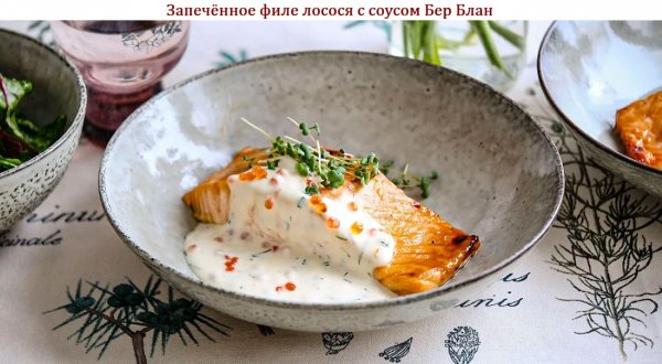 Описание: 🥣 Запечённое филе лосося с соусом Бер Блан✅ Нужно (на 4 порции)🔶 Для филе лосося:⇨ Филе лосося – 4 шт.⇨ Масло оливковое – 20 мл⇨ Соус Унаги – 40 г⇨ Лимонный сок – 20 мл⇨ Соль – 8 г⇨ Микрозелень – по вкусу🔶 Для соуса Бер Блан с икрой:⇨ Сливки 33% (классические) – 500 мл⇨ Вино белое сухое – 400 мл⇨ Икра лососевая зернистая – 100 г⇨ Икра щучья – 100 г⇨ Лук репчатый – 400 г⇨ Чеснок – 40 г⇨ Укроп – 25 г⇨ Тимьян (чабрец)– 5 г⇨ Масло растительное рафинированное – 40 мл⇨ Масло сливочное – 40 г⇨ Сахар-песок – 10 г⇨ Соль – 5 г✅ Готовка◆ – Для маринада смешайте соус Унаги, оливковое масло и лимонный сок, посолите. Полейте маринадом рыбу и оставьте на 20 минут.◆ – Разогрейте духовку до 210 °С. Выложите замаринованное филе лосося в форму для запекания и готовьте 8-10 минут.◆ – Для соуса Бер Блан нарежьте произвольно лук и чеснок. В глубоком сотейнике смешайте растительное и сливочное масло, добавьте лук и чеснок. Обжарьте на среднем огне, помешивая, 10 минут. Влейте белое вино, добавьте тимьян и уварите жидкость в 3 раза. Добавьте сливки и доведите до кипения. Приправьте соус солью и сахаром и процедите через частое сито в другой сотейник. Поставьте соус на огонь и уварите вдвое, снимите с огня.◆ – Перед подачей добавьте в соус икру и мелко нарезанный укроп. Разложите рыбу по тарелкам и полейте получившимся соусом. Украсьте микрозеленью.❗ НА ЗАМЕТКУ. В отсутствие соуса Унаги замариновать лосось можно просто в смеси оливкового масла и лимонного сока, или добавить к ним по половине столовой ложки дижонской горчицы и мёда.❗ КСТАТИ. Соус Бер Блан подают тёплым при температуре 30-40 градусов. Чтобы сохранить соус тёплым до момента подачи блюда, поставьте сотейник на водяную баню или перелейте в термос.