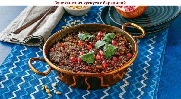 Описание: 🥣 Запеканка из кускуса с бараниной✅ Нужно (на 4 порции)-⇨ Соус наршараб – по вкусу⇨ Перец душистый – 1 ч.л.⇨ Корица молотая – 1 ч.л.⇨ Мякоть баранины – 500 г⇨ Кускус – 125 г⇨ Кедровые орехи – 50 г⇨ Лук репчатый – 5 шт.⇨ Соль – по вкусу⇨ Масло оливковое – по вкусу⇨ Перец чёрный молотый – по вкусу✅ Готовка◆ – Для запеканки мясо нарежьте средними кусками. Очистите 2 луковицы, крупно нарежьте и проверните через мясорубку вместе с мясом. Смешайте лук с мясом, добавьте соль, чёрный перец и половину корицы.◆ – Добавьте кускус и примерно 150 мл очень холодной воды. Перемешайте, чтобы получилась сочная однородная масса. Рукой распределите фарш по смазанной маслом форме для выпечки небольшого размера. Разровняйте верх и смажьте маслом.◆ – Ножом наметьте кусочки-ромбы и проведите им вдоль бортиков формы. Запекайте в разогретой до 180 °С духовке примерно 30 минут.◆ – Порубите орехи. Нарежьте оставшийся лук тонкими полукольцами, обжарьте в масле до золотисто-коричневого цвета, часто помешивая, 10 минут. Всыпьте орехи и обжаривайте ещё 2 минуты. Добавьте соль, перец, корицу, душистый перец и наршараб по вкусу. Обжаривайте ещё 1 минуту. Подавайте запеканку с луковой приправой, украсив кинзой и зёрнами граната.❗ НА ЗАМЕТКУ. Баранину с кускусом можно подавать с разнообразными приправами и соусами, например, с мятным йогуртовым или острой хариссой. К запеканке из кускуса отлично подойдёт свежий салат из овощей или зелёный гуакамоле.❗ КСТАТИ. Кускус в этом рецепте можно заменить булгуром, продуктом, наиболее близким ему по вкусу. Подойдёт также пшеничная крупа, ячневая или полтавская. Можно попробовать самостоятельно приготовить из пресного теста шарики размером с пшено.