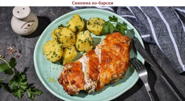 Описание: 🥣 Свинина по-барски✅ Нужно (на 6 порций)➦ Корейка свиная б/к (карбонад) – 900 г➦ Сметана 30% – 180 г➦ Сыр полутвёрдый – 150 г➦ Лук порей – 80 г➦ Огурец солёный – 1 шт.➦ Грецкий орех 3 – шт.➦ Петрушка – 3 веточки➦ Чеснок – 2 зубчика➦ Масло растительное рафинированное – по вкусу➦ Перец чёрный молотый – по вкусу➦ Соль – по вкусу✅ Готовка✔ — Подготовьте все ингредиенты для свинины по-барски. Кусок корейки оботрите влажным полотенцем и нарежьте на 6 одинаковых стейков. Полутвёрдый сыр натрите на средней тёрке.✔ — Лук порей (белую часть) нашинкуйте очень тонкими полукольцами. Очищенные грецкие орехи измельчите в мелкую крошку. Солёный огурец натрите на крупной тёрке и откиньте на сито, отжимать не нужно.✔ — У петрушки оборвите листочки с самыми тонкими веточками и измельчите. В миску добавьте сметану, солёный огурец, грецкие орехи, лук порей, петрушку и пропущенный через пресс чеснок.✔ — Поперчите соус для свинины по-барски, тщательно перемешайте. Попробуйте и добавьте соль по вкусу, не забывая, что сверху при приготовлении будет ещё и сыр в котором тоже достаточно соли.✔ — Куски свиной корейки накройте пищевой плёнкой и отбейте до нужной вам толщины. Кто-то предпочитает очень тонкие куски мяса, а кто-то отбивает совсем чуть-чуть, оставляя 2/3 толщины.✔ — Посолите и поперчите отбитое мясо. На прогретом растительном масле очень быстро обжарьте с двух сторон отбивные до золотистой корочки. Удалите излишки масла бумажными полотенцами.✔ — Переложите мясо на противень, застеленный пергаментом. На каждую отбивную намажьте соус, толщиной не менее 3-5 мм и посыпьте сверху сыром. Выпекайте в духовке при 200 °С 20-30 минут в зависимости от толщины мяса. Свинина по-барски с солёным огурцом готова, подавайте с гарниром.🔥 НА ЗАМЕТКУ: В данном случае свинина по-барски — рецепт без гарнира, но вы при запекании под мясо можете разложить ровным слоем картофель. Его необходимо будет нарезать ломтиками, толщиной в 5 мм и предварительно бланшировать в кипятке не менее 7 минут до полуготовности.🔥 КСТАТИ: Для мяса по-барски из свинины необязательно использовать корейку, подойдут и другие отрубы. Стейки вы можете нарезать из окорока или шейной части.