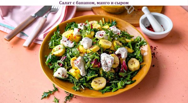 Описание: 🥣 Салат с бананом, манго и сыром✅ Нужно (на 4 порции)➦ Салатный микс – 100 г➦ Банан – 2 шт.➦ Манго – 1 шт.➦ Сыр Козий – 200 г➦ Перец розовый молотый – по вкусу🔶 Для заправки:➦ Масло оливковое – 4 ст.л.➦ Горчица дижонская – 1 ст.л.➦ Горчица зёрнышками – 1 ст.л.➦ Мёд – 1 ст.л.➦ Лимонный сок – 1 ст.л.➦ Куркума – ½ ч.л.➦ Соль – по вкусу➦ Перец чёрный молотый – по вкусу✅ Готовка✔ — Для заправки выложите все ингредиенты в баночку с закрывающейся крышкой, приправьте куркумой, солью и перцем, закройте крышку и энергично потрясите.✔ — У манго удалите кожицу, срежьте мякоть с косточки, нарежьте удобными для еды кусочками. Очистите бананы, нарежьте средними кусочками.✔ — Смешайте бананы, манго и смесь салатных листьев с половиной заправки, разложите по небольшим глубоким тарелочкам. Сверху выложите кусочки козьего сыра, полейте оставшейся заправкой, приправьте ещё перцем и подавайте.🔥 КСТАТИ. Для этого салата можно использовать не только куркуму, но и другие специи. Попробуйте ещё и кориандр или имбирь, чтобы придать салату новые ноты и подчеркнуть вкусовые нюансы фруктов. 🔥 НА ЗАМЕТКУ. Этот салат будет очень хорош с курицей или блюдами из морепродуктов. При желании к нему также можно подать бокал белого сухого вина.