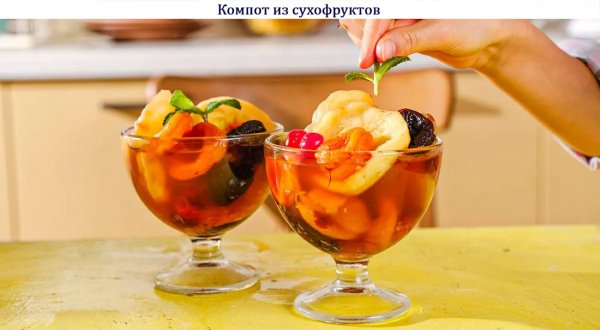 Описание: 🥣 Компот из сухофруктов✅ Нужно (на 10 порций)➦ Чернослив – 130 г➦ Курага – 130 г➦ Груша сушёная – 130 г➦ Яблоки сушёные – 130 г➦ Изюм – 80 г➦ Клюква сушёная – 80 г➦ Лимон – 1 шт.➦ Гвоздика – 3 шт.➦ Перец душистый горошек – 3 шт.➦ Лавровый лист – 2 шт.➦ Сахар коричневый – 100 г✅ Готовка✔ — Чернослив, курагу, груши, яблоки, изюм и клюкву тщательно промойте под струей тёплой проточной воды по отдельности. А затем откиньте на дуршлаг, чтобы стекла лишняя жидкость.✔ — В широкую и глубокую кастрюлю влейте 2 л питьевой воды и добавьте сахар, перемешайте. Поставьте на плиту и на среднем огне доведите до кипения. Сахар должен раствориться.✔ — Уменьшите огонь до минимального и варите компот под крышкой в течение ещё 15 минут. Когда жидкость немного загустеет, можно добавлять оставшиеся ингредиенты.✔ — Гвоздику, душистый перец и лавровый лист переложите в ступку и слегка растолките. Лимон тщательно промойте, обсушите. Мелкой тёркой снимите с него цедру.✔ — Толченные в ступке специи, лавровый лист и лимон выложите в компот и перемешайте. Варите напиток ещё 5 минут. Затем снимите с огня. При необходимости добавьте ещё сахар.✔ — Жидкости в компоте должно быть немного, сухофрукты должны хорошо пропитаться пряностями. Компот разлейте по бокалам и подавайте горячим с сухофруктами.🔥 НА ЗАМЕТКУ. Количество сахара в напитке можно регулировать по своему вкусу. Замените его на мёд, либо вообще откажитесь: сухофрукты и так очень сладкие. Подавать компот принято тёплым, в низких широких чашках.🔥 КСТАТИ. Варите компот при закрытой крышке. Контакт жидкости и фруктов с воздухом препятствует сохранению в нём полезных витаминов. И обязательно после приготовления, дайте настоять ему 4-5 часов. Вкус получится более насыщенным.