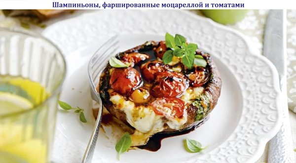 Описание: 🥣 Шампиньоны, фаршированные моцареллой и томатами✅ Нужно (на 4 порции)➦ 8 шампиньонов портобелло➦ 120 г моцареллы для пиццы➦ 150 г разноцветных помидоров черри➦ 60 г сливочного масла➦ 2 зубчика чеснока➦ 2 веточки петрушки➦ 2 веточки базилика➦ соль, молотый чёрный перец➦ бальзамический соус для подачи✅ Готовка✔ — Для приготовления шампиньонов, фаршированных моцареллой и томатами разогрейте духовку до 200 °C. Противень застелите бумагой для выпечки.✔ — Удалите ножки грибов, они не понадобятся. Шляпки протрите влажным полотенцем. Нарежьте помидоры на половинки, сыр нарежьте ломтиками. Измельчите чеснок и листья петрушки.✔ — В небольшой сковороде растопите сливочное масло, добавьте петрушку и чеснок, прогрейте 30 секунд и снимите с огня. Обмакните в масло шляпки грибов и разложите на противне. Оставшееся масло распределите по внутренней части шляпок. Наполните грибы ломтиками сыра и помидоров, посолите, приправьте перцем и запекайте в центре духовки до золотистого цвета, примерно 10-12 минут.✔ — Переложите грибы на тарелку, полейте бальзамическим соусом и посыпьте мелко нарезанными листьями базилика.🔥 НА ЗАМЕТКУ. Ножки грибов можно использовать в приготовлении других блюд, например, пожарить с картошкой или отдельно с луком, добавить в салат или суп. В принципе их также можно добавить в начинку, но и без них закуска получится идеальной.🔥 КСТАТИ. Портобелло — это, можно сказать, элитный шампиньон. Он гораздо крупнее своих сородичей (его шляпка может быть 10-15 см в диаметре), более ароматный и с более плотной текстурой. Именно эти шампиньоны чаще всего фаршируют различными начинками — удобно и получается вкуснее, чем с более мелкими.