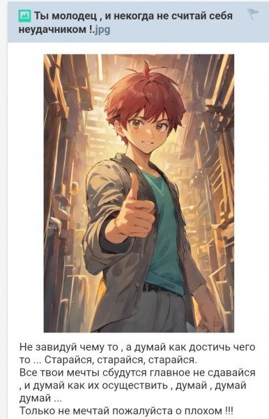 Описание: Пожалуйста радуйся жизни ! Радуйся работе, отдыху, разговорам, играм, прогулкам ... Пожалуйста если тебе плохо держись , когда сможешь обдумать ДУМАЙ и не останавливайся пойми , почему плохо было ? В чем ты был не прав в жизни ? Как не допустить прошлого горя ? Как от будущего горя защитится , которое ещё не прошло ? Думай как быть счастливым , пробуй , думай старайся ... Прошу тебя !Пусть твоя жизнь будит удачной , хорошей , успешной ...