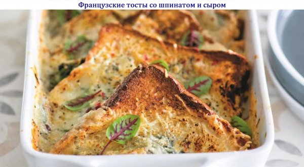 Описание: 🥣 Французские тосты со шпинатом и сыром✅ Нужно (на 6 порций)➦ 8-10 ломтиков хлеба для тостов➦ 6 больших яиц➦ 120 г твёрдого сыра➦ 100 г сливочного масла➦ 100 мл молока➦ 50 г сыра с голубой плесенью➦ 200 г шпината➦ 1 луковица➦ соль, молотый чёрный перец➦ микрозелень для подачи✅ Готовка✔ — Разогрейте духовку до 100 °С и разложите на противне в один слой ломтики хлеба. Запекайте 15 минут, переверните на другую сторону и готовьте ещё 10-15 минут. Подсушенный хлеб выньте и смажьте с одной стороны сливочным маслом, разрежьте по диагонали пополам.✔ — Растопите в сковороде 2 ст. л. сливочного масла и обжарьте до прозрачности нарезанный кубиками лук, 3-4 минуты. Добавьте шпинат (если листья крупные, мелко нарежьте их), посолите, приправьте перцем и готовьте ещё 2 минуты.✔ — Керамическую прямоугольную форму смажьте сливочным маслом. Взбейте яйца с молоком, солью и перцем и влейте в форму. Добавьте лук со шпинатом и 100 г тёртого твёрдого сыра и перемешайте.✔ — Положите в форму хлеб, располагая его внахлёст углом вверх. Добавьте наломанный на кусочки сыр с голубой плесенью.✔ — Накройте форму пищевой плёнкой. Уберите форму в холодильник минимум на 1 час.✔ — За час до подачи выньте форму из холодильника и оставьте на 20 минут в тепле.✔ — Разогрейте духовку до 200 °С. Посыпьте оставшимся тёртым сыром и запекайте тосты на среднем уровне духовки в течение 35-40 минут. Подавайте, украсив микрозеленью.🔥 НА ЗАМЕТКУ. Французские тосты со шпинатом и сыром — звучит красиво! Сразу же представляется уютное кафе на Елисейских полях, чашечка кофе и элегантная тарелочка с тостом. Хотите знать, что из себя представляет столь утончённое блюдо? Тогда вам нужно вернуться в ваше советское детство. Да-да, не удивляйтесь. Помните, когда мама угощала вас за завтраком ломтиком хлеба в яично-молочной заливке? Это был как раз он, французский тост! Блюдо популярное не только во Франции, но и во всём мире. Чаще для тоста используют сдобную булочку — бриошь. Но и из обычного батона готовить тоже можно! Рецептов множество: жарят и сладкие, и несладкие на вкус ломтики. Первые — можно подавать с рыбой и творожным сыром, а вторые — с шариком мороженного и фруктами. Хлеб готовят на сковороде или, как в этом рецепте, запекают в духовке. Просто и полезно!