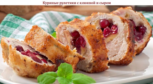 Описание: 🥣 Куриные рулетики с клюквой и сыром✅ Нужно (на 2 порции)➦ Филе куриной грудки – 2 штуки➦ Соль – по вкусу➦ Перец чёрный молотый – по вкусу➦ Твёрдый сыр – 200 г➦ Клюква (свежая или замороженная) – 200 г➦ Растительное масло – 2 ст. ложки✅ Готовка✔ — Разогрейте духовку до 200 °C. Подготовьте форму для запекания.✔ — Сделайте на грудках продольные надрезы, раскройте их. Застелите пищевой плёнкой и отбейте молотком. Посолите и поперчите.✔ — Натрите сыр. Распределите его по грудкам. Посыпьте сверху клюквой. Замороженные ягоды нужно заранее оттаять.✔ — Сверните грудки. Оберните их нитью или закрепите края зубочистками. Выложите в форму.✔ — Смажьте рулетики маслом. Посыпьте солью и перцем снаружи. Выпекайте около 30 минут до румяности.