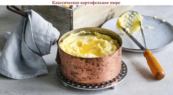 Описание: 🥣 Классическое картофельное пюре✅ Нужно (на 6 порций)➦ картофель – 1 кг➦ яичный желток – 2 шт.➦ сливочное масло – 100 г➦ молоко жирностью 3-6% – 250-350 г➦ соль✅ Готовка✔ — Поставьте на сильный огонь широкую кастрюлю, налив туда примерно 2 л воды, пусть закипает.✔ — Очистите картофель от кожуры, не разрезайте.✔ — Посолите закипевшую воду, положите картофель. Дождитесь, когда вода снова закипит. Закройте кастрюлю крышкой, огонь уменьшите ровно настолько, чтобы вода не убегала. Варите картофель 25-35 минут, он должен стать очень мягким.✔ — Пока картофель варится, нарежьте холодное сливочное масло небольшими кусочками. Смешайте желтки с 50 г молока и немного посолите. Оставшееся молоко нагрейте до кипения.✔ — Осторожно слейте с картофеля воду. Начните разминать картофель в пюре, всё время подбрасывая в кастрюлю по несколько кубиков масла.✔ — Когда всё масло впитается, влейте желтковую смесь и перемешайте.✔ — Теперь начните подливать горячее молоко, продолжая разминать картофель. Подливайте понемногу, чтобы уловить момент, когда пюре достигнет той консистенции, которую вы любите.🔥 НА ЗАМЕТКУ. Очень вкусно получится, если подать картофельное пюре с зажаренным беконом, хрустящим жареным луком и мелко нарезанной зеленью.🔥 КСТАТИ. Чтобы сохранить пюре тёплым до подачи на стол, можно воспользоваться бабушкиным способом и обернуть кастрюлю газетой и тёплым пледом, а можно современным — поставить посуду с пюре в разогретую до 50 градусов духовку. Такое томление сделает пюре ещё вкуснее.