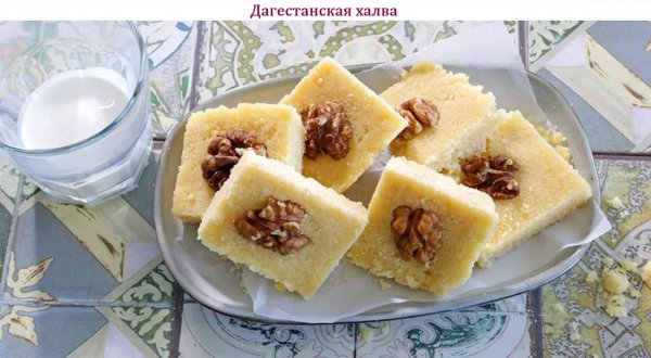 Описание: 🥣 Дагестанская халва✅ Нужно (на 8 порций)➦ 300 г муки➦ 200 г сахара➦ 180 г сливочного масла➦ 100 г грецких орехов✅ Готовка✔ — В большом сотейнике растопите на медленном огне сливочное масло. В три приёма всыпьте муку, интенсивно перемешивая после каждого. Продолжайте готовить, не прекращая перемешивать массу, примерно 45 минут.✔ — Добавьте в сотейник сахар и продолжайте нагревать, перемешивая, ещё 10 минут. Сахар должен полностью раствориться.✔ — Квадратную форму размером 18×18 или 20×20 см застелите пищевой плёнкой. Переложите массу в форму и разровняйте лопаткой. Должен получиться пласт толщиной примерно 2,5 см. Прямо в форме нарежьте халву на квадраты, каждый украсьте половинкой грецкого ореха. Полностью остудите и разложите на блюде.🔥 НА ЗАМЕТКУ. Дагестанская халва – это не то, что вы привыкли покупать в магазине. Готовится она из муки (пшеничной, кукурузной или рисовой) с сахаром, сливочным маслом (можно заменить на топлёное – именно с ним чаще всего её делают) и украшается грецкими орехами. В неё можно добавить ваниль или одноимённую эссенцию. Вместо песка взять сахарную пудру – она получится ещё более нежной, деликатной. А для более яркого вкуса положить лимонную цедру: так поступают при готовке лезгинской иситы, одной из разновидностей десерта. Во всех случаях эта сладкая «симфония» будет буквально таять во рту и рассыпаться в руках (возможно, поэтому тоже её режут на небольшие порционные ромбики). Похожее блюдо изготавливают в большинстве регионов Кавказа, на Балканах, в Индии и в странах Ближнего Востока. Кстати, на арабском эта восточная сладость называется халява. Теперь вы знаете про это лакомство всё.