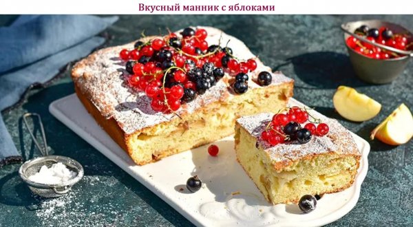 Описание: 🥣 Вкусный манник с яблоками✅ Нужно (на 6 порций)➦ 150 г манной крупы➦ 110 г муки➦ 130 г сахара➦ 2 яйца➦ 180 г сметаны➦ 2 небольших сладких яблока➦ щепотка соли➦ 1/3 ч. ложки разрыхлителя➦ сливочное масло для смазывания формы✅ Готовка✔ — Форму смазать сливочным маслом. Духовку включить на разогрев до 180 градусов.✔ — Смешать манку, муку, сахар, соль и разрыхлитель.✔ — Яблоки нарезать на 4 части, удалить сердцевину и затем порезать на тонкие ломтики поперек кусочков (четвертинок).✔ — Яйца взбить с сахаром.✔ — В сухие ингредиенты добавить сметану и взбитые яйца.✔ — Аккуратно перемешать.✔ — Добавить в тесто яблоки, аккуратно перемешать и выложить тесто для манника с яблоками в смазанную форму. Выпекать 50-60 минут. Подавать манник с яблоками слегка посыпав сахарной пудрой, украсив ягодами.