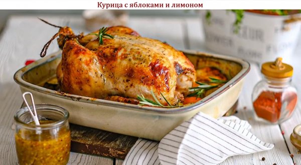 Описание: 🥣 Курица с яблоками и лимоном✅ Нужно (на 4 порции)🔹 Курица – 1 шт.🔹 Яблоко – 2 шт.🔹 Лимон узбекский – 2 шт.🔹 Масло сливочное – 100 г🔹 Розмарин – 2 веточки🔹 Чеснок – 4 зубчика🔹 Масло оливковое – по вкусу🔹 Соль – по вкусу🔹 Перец чёрный молотый – по вкусу✅ Готовка🔸 — Яблоки разрежьте на четвертинки, удалите сердцевину. Выложите на застеленный пергаментом противень. Лимоны разрежьте на четвертинки и добавьте к яблокам. Полейте оливковым маслом, приправьте солью и перцем. 🔸 — Нарежьте холодное сливочное масло тонкими пластинками и выложите на лист пергамента, лежащий на доске. Посыпьте масло солью и перцем, положите в морозильник на 10 минут.🔸 — Обсушите курицу бумажными полотенцами. Аккуратно отсоедините кожу на грудке и ножках. Вложите между мясом и кожей пластинки масла. Натрите курицу солью и перцем. 🔸 — Розмарин и чеснок положите курице в брюшко. Сколите кожу на брюшке шпажкой, свяжите ножки, крылышки подверните под мышки. 🔸 — Положите курицу на фрукты грудкой вниз. Запекайте в разогретой до 180 °С духовке 40 минут. Переверните и запекайте ещё 20-30 минут. Подавайте с фруктами.🔥 КСТАТИ. Можно запекать курицу в течение всего времени приготовления грудкой вверх, не переворачивая, но скорее всего этот способ приведёт к тому, что грудка получится слишком сухой, поэтому не поленитесь и сначала запекайте курицу грудкой вниз, а затем, за 20 минут до готовности, переверните грудкой вверх, чтобы получить красивую хрустящую корочку и с этой стороны.🔥 НА ЗАМЕТКУ. В дополнение к яблокам и лимонам можно использовать дольки апельсинов и сухофрукты, добавив веточку тимьяна или розмарина.