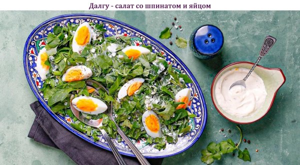 Описание: 🥣 Далгу - салат со шпинатом и яйцом✅ Нужно (на 4 порции)🔹 Шпинат – 150 г🔹 Мята свежая – 5 веточек🔹 Кинза – 5 веточек🔹 Лук зелёный – 50 г🔹 Яйцо куриное – 5 шт.🔹 Сметана 18% – 5 ст.л.🔹 Соль – по вкусу🔹 Перец чёрный молотый – по вкусу✅ Готовка🔸 — Залейте яйца холодной водой, доведите до кипения и варите на среднем огне 7 минут. Остудите в холодной воде и очистите от скорлупы. 🔸 — Отделите от стеблей листья кинзы и мяты. Удалите жёсткие стебли шпината. Мелко нарежьте всю зелень и сложите в миску. 🔸 — Два яйца разрежьте на четвертинки. Оставшиеся яйца разделите на желтки и белки. Белки нарежьте мелкими кубиками. Желтки разомните вилкой, смешайте со сметаной и белками, посолите и приправьте перцем. 🔸 — Получившуюся заправку выложите в миску с зеленью и аккуратно перемешайте. Выложите салат на блюдо, украсьте четвертинками яиц, поперчите и сразу подавайте к столу.🔥 НА ЗАМЕТКУ. Далгу – зелёный салат с яйцом – пришёл к нам из дагестанской, а точнее – лакской, кухни. Традиционно в этот салат готовили весной, добавляя в него всю доступную разнообразную зелень и обязательный зелёный лук. Часто в салате использовали молодую крапиву и лебеду. Здесь предлагают вам приготовить Далгу с доступными в любое время года шпинатом, кинзой и мятой. Сметану в заправке можно заменить на другой плотный кисломолочный продукт, например, мацун.🔥 КСТАТИ. В такой салат можно добавить любую молодую зелень: щавель, сныть, ботву редиса, свёклы или моркови, капустную рассаду.