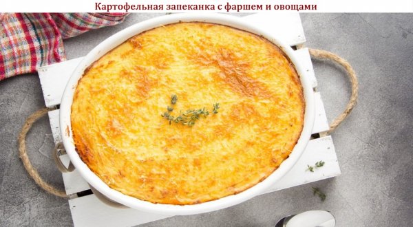 Описание: 🟥 Картофельная запеканка с фаршем и овощами✅ Нужно: на 8 порций⏩ Картофель – 1 500 г⏩ Соль – по вкусу⏩ Растительное масло – 2-4 ст. ложки⏩ Мясной фарш – 750 г⏩ Лук – 1 штука⏩ Морковь – 1 штука⏩ Молотый чёрный перец – по вкусу⏩ Молотый мускатный орех – по вкусу⏩ Лавровый лист – 2-3 штуки⏩ Сливочное масло – 100 г + для смазывания⏩ Сметана – 1 ст. ложка⏩ Твёрдый сыр – 200 г🔶 Можно добавить:⏩ Зелень – по вкусу✅ Готовка: 1 ч.👉 Очистите картошку и выложите в кастрюлю. Залейте водой, подсолите и отварите до мягкости.👉 Тем временем разогрейте в сковороде масло. Выложите туда фарш и обжаривайте, помешивая, пока мясо не поменяет цвет с красного на светло-коричневый.👉 Добавьте рубленый лук и тёртую морковь. Приправьте солью, перцем и мускатом, положите лаврушку.👉 Перемешайте и готовьте ещё несколько минут, чтобы овощи смягчились. При желании добавьте мелко нарезанную зелень. Удалите лавровые листья.👉 С готовой картошки слейте жидкость. Пюрируйте толкушкой, добавив сливочное масло и сметану.👉 Смешайте пюре с половиной тёртого сыра.👉 Смажьте сливочным маслом форму для выпечки. Выложите половину картофеля и разровняйте.👉 Сверху разместите фарш и покройте второй половиной пюре. Посыпьте оставшимся сыром.👉 Запекайте в духовке при температуре 180 °C в течение 20-25 минут. Верх должен подрумяниться.🔷 НА ЗАМЕТКУ. Между двумя слоями нежного пюре скрывается ароматное обжаренное мясо с овощами. Это блюдо очень простое, но такое аппетитное, что вы наверняка его полюбите.