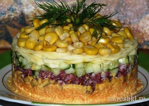 Описание: Ингредиенты:-Морковь - 2 шт.-Чеснок - 3-4 зубчика-Копченая колбаса - 200 г.-Огурец свежий - 2 шт.-Сыр - 200 г.-Кукуруза консервированная - 1 б.-Майонез - 200 г.Способ приготовления:Шаг 1. Морковь сырую натереть на средней терке и смешать с чесноком пропущенным через пресс и майонезом.Шаг 2. Колбасу и огурцы нарезать маленькими кубиками.Шаг 3. Сыр натереть на средней терке.Шаг 4. Выкладывать салат слоями: морковь с чесноком, далее колбасу и смазать майонезом, далее огурцы, затем сыр и сверху выложить кукурузу.Шаг 5. Украсить салат веточкой укропа.