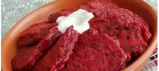 Описание: Ингредиенты*************************Свекла отварная ... 1 шт.Мука ... 3 ст.л.Яйцо ... 1 шт.Соль ... 1/4 ч.л.Разрыхлитель ... 1/2 ч.л.Чеснок ... 1 зубокЗелень ... по вкусуМасло растительное ... 2-3 ст.л.Описание*********************Свекольные оладьи с удовольствием едят даже те, кто свёклу не любит. Еще вкусней будут оладьи, если подавать их с соусом из сметаны. Способ приготовления"""""""""""""""""""""""""""""""""Свёклу очистите и натрите на средней тёрке. Положите в свёклу яйцо, соль, мелко нарезанный укроп и пропущенный через пресс чеснок. Добавьте муку с разрыхлителем. Размешайте. В сковороде на среднем огне разогрейте растительное масло. Столовой ложкой выложите на сковороду лепёшечки теста. Обжарьте с двух сторон до зарумянивания - примерно по 2-3 минуты. Для соуса смешайте все ингредиенты.Как и с чем подавать""""""""""""""""""""""""""""""""" Подавайте оладьи со сметанным соусом.