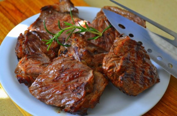 Описание: Говядина в остром соусе на грилеПриготовить маринад из соуса чили, сока лайма, крупно молотого черного перца. Перемешать мясо (1 кг говяжьей вырезки,нарезанной на куски) с маринадом и убрать в холодильник на 2 часа или на ночь. Вынуть из маринада и обжарить на гриле или сковороде гриль. Обжаренное мясо залить оставшимся маринадом и потушить до мягкости.При необходимости посолить по вкусу во время тушения.