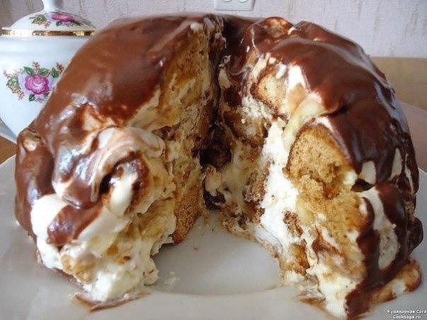 Описание: Потрясающий торт из пряников! Бесподобный торт на скорую руку!Этот тортик весьма удобен тем, что готовится он легко, просто и на удивление быстро, ведь, в отличие от более традиционных вариантов таких сладостей, для его приготовления никаких коржей выпекать не нужно - такой торт готовится из пряников, которые уже готовыми можно купить в любом магазине, ну а промазываются пряничные слои кремом из сметаны.Для того, чтобы приготовить вкусненький торт по предлагаемому рецепту, вам будут нужны такие продукты: половина килограмма пряников (самых обыкновенных и недорогих), 500 граммов сметаны (достаточно жирной и густой), 100 граммов сахарной пудры, два спелых банана, а также один стакан очищенных от скорлупы грецких орехов.Грецкие орехи необходимо слегка обжарить на раскаленной сухой сковородке, а после этого мелко нарубить их. Пряники следует нарезать на пластинки толщиной примерно три-четыре миллиметра, бананы очистить от кожуры и порезать еще более тонкими, по сравнению с пряниками, кружочками. Сметану смешать с сахарной пудрой и слегка взбить до образования густого однородного крема.Подходящую посудину (глубокую миску или кастрюльку) нужно застелить пищевой пленкой и затем выкладывать в нее слоями щедро смоченные в сметанном креме пряники и кружочки бананов, при этом каждый слой посыпается измельченными орехами. Сверху тортик надо также прикрыть пленкой, аккуратно утрамбовать руками и убрать в холодильник на 10-12 часов.Готовый охлажденный торт нужно выложить на плоское блюдо, убрать пленку и подавать к столу.По желанию можно уже готовый торт полить шоколадной глазурью.