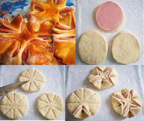 На скорую руку. Слоеное тесто из магазина, калбаса вареная, яйцо для помазать сверху перед выпечкой. Быстро, вкусно,необычно даже на праздничном столе
