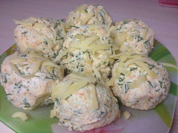 Описание: Салатик - Наивкуснейшие шарики!Салат очень вкусный и эффектный. Гости всегда спрашивают рецепт)Время приготовления: 10 мин.Порций: по желаниюВам потребуется:куриная грудка отварнаяотварная морковьукроп2 вида сыра (я используя маасдам и король Артур)майонезКак готовить: 1. Курицу режем мелкими кубиками,чем мельче тем лучше.2. Морковь трем на мелкой терке.3. Укроп мелко шинкуем.4. Сыра я беру 2 вида. Один для обсыпки,другой добавляю в сам салат. Один более пряный,другой нежный. В зависимости от того чего вам хочется больше,то добавляем в саму смесь. Я всегда маасдам использую для посыпки. Трем на мелкой терке.5. Заправляем майонезом.6. Из получившейся смеси делаем шарики. В идеале каждый шарик нужно обвалять в сыре,но мне было очень лень,поэтому я просто посыпала сверху сыром ( к тому же и натерла его на крупной терке).Приятного аппетита!