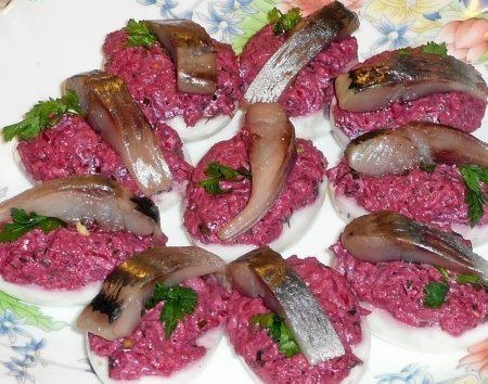Описание: Ленивая шубаИнгредиенты:- 4 яйца- 2 свеклы- 1 лук- 1 селедка- 200 гр майонеза- 2-3 зубчика чеснока- зелень - укроп, петрушка- соль - по вкусуПриготовление:1. Отварить свеклу, яйца, остудить, очистить. Яйца разрезать пополам, отделить белки от желтков. Свеклу натереть на крупной терке.2. Желтки размять вилкой, мелко нарезать лук и половину селедки. Все хорошо перемешать до получения однородной массы, посолить, поперчить.3. Затем добавить майонез, измельченный чеснок и немного мелко нарубленной зелени и еще раз перемешать.4. Нафаршировать полученной массой корзинки из половинок яичного белка, ленивая шуба готова.5. Сверху положить кусочки селедки. Украсить зеленью.