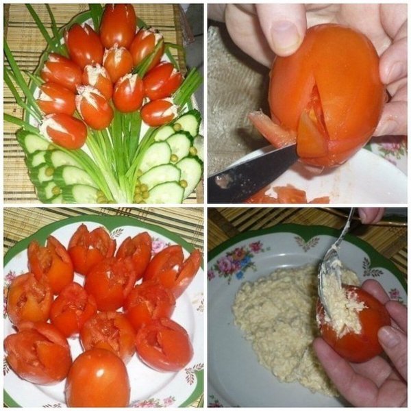 Описание: Салат "Тюльпаны"Ингредиенты:помидорысыр2 яйцачеснокгрецкий орехмайонезПриготовление:1. Делаем тюльпанчик нарезаем лепестки в верхней части помидора, лучше если помидоры будут потверже.2. Убираем, то что мы надрезали. Ножиком АККУРАТНО.3. Потом ложечкой вынимаем сердцевинку, вынимать до половины помидорки, чтобы вкус помидора тоже присутствовал, но это кому как нравится если любите больше начинки вынимайте больше сердцевинки.4. Для начинки сыр, два яйца сварить, чеснок, грецкий орех и майонез.Приятного аппетита!