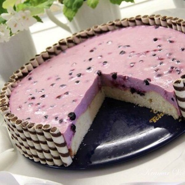 Описание: Йогуртовый тортОчень воздушный, не приторный и лёгкий тортик!Для формы 26см.нам понадобится:тесто:яйцо 2 штсахар 100 гркефир 100 млмука 150 грванильный сахар 0,5 ч.лразрыхлитель 0,5 ч.лрастительное масло 25 млсуфле:йогурт питьевой (у меня черничный) 800 млсахар 50 гржелатин 20 грмолоко 50 млсвежая черника 1 стаканЯйца взбить с сахаром, добавить ванильный сахар, кефир, масло и ещё раз хорошо взбить. Муку просеять и смешать с разрыхлителем. Соединить две смеси и перемешать ложкой. Вылить тесто в разъёмную форму и выпекать в заранее разогретой духовке при 180С примерно 25 минут (готовность проверить сухой зубочисткой). Достать корж из духовки и оставить его в форме до полного остывания.Приготовить суфле: желатин залить молоком и оставить для набухания, затем поставить на огонь и прогреть до полного растворения (не кипятить!). Йогурт смешать с сахаром. Влить тонкой струйкой тёплый желатин в йогурт. Хорошо перемешать. Добавить ягоды и перемешать.Вылить смесь на остывший корж. Поставить торт в холодильник до полного застывания. Достать наш торт и аккуратно снять бортики. Украсить можно по Вашему желанию, я украсил вафельными трубочками. Приятного чаепития!!!!