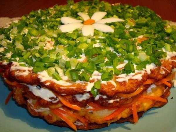 Описание: ЗАКУСОЧНЫЙ МЯСНОЙ ТОРТИК.Продукты: 400г куриного филе, одна луковица, чуть больше половины стакана молока, стакан муки, 3 яйца, 300 г моркови по-корейски.Филе и лук измельчить в блендере, вбить яйца, добавить молоко и муку, соль, перец, хорошо перемешать. Жарить на среднем огне на растительном масле, выкладывать массу на сковороду ложкой и быстро разровнять. Переворачивать и снимать блинчики кулинарной лопаткой. У меня получилось пять блинов. Далее взять майонез, добавить 2-3 зубка чеснока. Блинчик смазать слегка майонезом, положить на него морковь по корейски, опять блинчик + майонез + морковь и т.д. Верхний слой украсить по желанию. В исходном рецепте смазывать майонезом не предполагалось, но мне показалось, что тортик будет суховатый. ПРИЯТНОГО АППЕТИТА.
