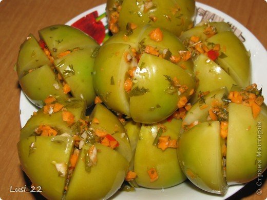 Описание: Пучок базилика,пучок сельдеря,1 ст.л. соли,1 л воды,2-3 головки чеснока,1 кг красных помидор среднего размера,1 маленькая морковка (с морковкой вкусно)На 1 л воды понадобится 1 ст.л. соли. Солим воду. Разрезаем помидоры крест накрест, но не до конца. Влаживаем в каждый помидор начинку из мелко нарезанного сельдерея, базилика, морковки и чеснока. Улаживаем помидоры в миску с подсоленой водой, где они и будут мариноваться. Придавливаем крышкой, чтоб "утопить" помидоры. Сверху ставим какой-нибудь груз. Оставляем помидоры мариноваться в тепле на 5 дней примерно (не ставя в холодильник).Я использовала красные помидоры, но не зелёные как на фото. Получаются очень вкусные помидоры. Можно в начинку добавить мелко нарезанный балгарский перец или морковку, кому как нравится. Приятного аппетита!