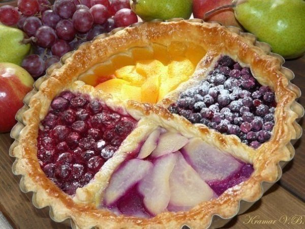 Описание: Пирог " Ягодное лукошко "Очень вкусный пирог из разряда гости на пороге!!!))))Нам потребуется:1 уп. готового слоёного тестаягоды и фрукты для начинки можно использовать любые(у меня вишня,чёрная смородина,персики,груши).Приготовление:1. Разморозить тесто, две полоски оставить для разделения начинки.2. Остальное тесто немного раскатать и уложить в форму (смазанную растительным маслом), сформировать бортики.3. Две полоски (которые мы оставили) скрутить в жгут и положить крест- накрест.4. У нас получилось четыре отдельных места для начинки. Выкладываем наши ягоды и фрукты. Если ягоды замороженные добавьте немного крахмала (чтобы они не потекли).5. Груши и персики можно посыпать сахаром. Верхушку теста смазываем яичным желтком.6. Ставим наш пирог в заранее разогретую духовку и выпекаем при 180С примерно 25 минут.7. При подаче можно посыпать сахарной пудрой.Приятного аппетита!