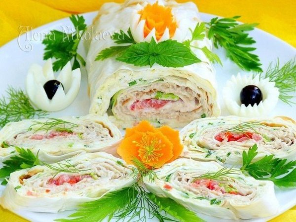 Описание: Рулет с горбушей и помидорамиИнгредиенты:Лаваш — 1 листКонсервированная горбуша — 1 банка Огурец — 1 шт.Помидор — 1–2 шт.Яйца куриные — 4–5 шт.Майонез — 100 гЗеленый лук — 70 гСалат листовойСоль по вкусуПриготовление:1. Рыбу выложить в тарелочку и помять вилкой. 2. Яйца отварить и нарезать небольшими кубиками. 3. Зеленый лук мелко порубить. Смешать яйца, зеленый лук и чуть майонеза, можно чуть присолить, перемешать. Лаваш освободить от упаковки. Выглядит лаваш для рулета большим длинным прямоугольником, примерно 70–80 см длиной и шириной примерно 20 см. 4. Разложить лаваш на столе и смазать по всей длине и ширине майонезом. Затем лаваш делим визуально на две части и на одну часть равномерно выкладываем яйца с луком, а на вторую половину лаваша — рыбу. 5. Помидоры нарезать небольшим кубиком или на пластинки и выложить на один край с которого потом начнем сворачивать рулет. На помидоры выложить листья салата.6. Огурец нарезать овощечисткой на длинные ленты и выложить чуть внахлест друг на друга на стыке начинок, т. е. примерно в середине лаваша.7. Со стороны помидорок начинаем аккуратно и плотно сворачивать лаваш в рулет. Рулет завернуть в пищевую пленку и убрать в холодильник на пару часов, можно на ночь. Перед подачей рулет нарезать на кусочки.