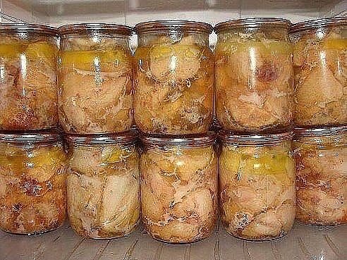 Описание: Вкуснейшая домашняя тушенка из курицы Домашняя тушенка из курицы- это очень вкусно. Да и к тому же это отличный способ полентяйничать вечерок- другой, так как просто отваренная картошка с домашней тушенкой съедается моментально! Такая тушёнка всегда выручает, когда внезапно нагрянут гости и нужно, что-то быстро приготовить.С 2 кг мяса вышло 2 баночки тушенки по 700 г каждая. Ингредиенты Курица- 2000 граммов Перец черный горошек- 20 штук Соль- 20 граммов Лавровый лист- 4 штуки Приготовление 1. С мяса курицы снимаем кожу, нарезаем мелкими кусочками, отделаем мяско от костей, укладываем в кастрюльку, солим, перчим, используем любые приправы, которые вам нравятся. Ставим кастрюльку с мяском минут на 40 в холодильник. 2. Банки тщательно стерилизуем. 3. Укладываем по 10 перчинок горошком и по 2 лавровых листочка на дно каждой стерильной баночки. 4. В банки раскладываем мясо, не нужно их "набивать" очень плотно. Накройте их фольгой вместо крышки. 5. Банки отправляем в холодную духовку, включаем на 150 С и оставляем на 4,5 часа. 6. Когда отключите духовку пусть банки постоят там еще пол часа, чтобы остыли. Затем достаньте банки и закатайте их стерилизованными крышками, переверните. Домашняя тушенка из курицы готова! Приятного аппетита!