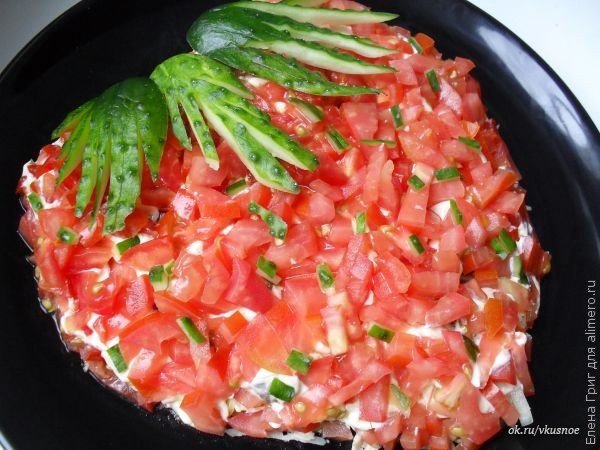 Описание: Салат "Клубничка"Для приготовления нам понадобятся следующие ингредиенты: 1. Отварное куриное филе 250-300 г2. Шампиньоны 200 г3. Помидоры 300 г4. Репчатый лук 1 шт.5. Твердый сыр 150 г6. Огурец 1 шт.7. Растительное масло для жарки 2-3 ст. ложки8. Майонез оливковый 5 ст. ложек9. Соль по вкусу Грибы вымыть и порезать на небольшие кусочки. Приготовить их на сковороде, обжарив в растительном масле. Куриное филе мелко нарезать. Очищенный лук мелко нашинковать. Слоями выкладывать ингредиенты в следующей последовательности: мясо и лук. Смазать слой майонезом, посолить, затем посыпать тертым на мелкой терке сыром, сверху грибы. Снова майонез. Нарезанные мелкими кубиками помидоры будут верхушкой салата. Из огурца сделать листики и семечки. Блюдо готово! Желаю всем приятного аппетита!
