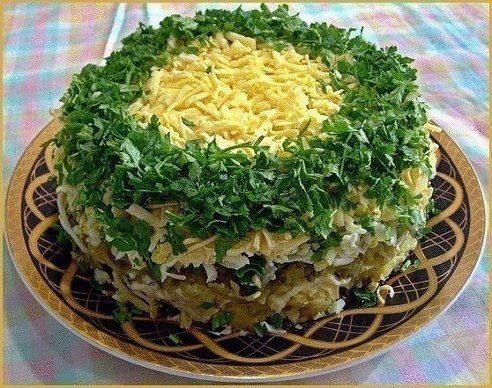 Описание: Салат "Грибы под шубой"Ингредиенты:500 гр грибов1-2 головки репчатого лука3-4 вареные картофелинызеленый лук3-4 яйцанесколько соленых огурцов200 гр твердого сырамайонезПриготовление:1.Грибы перебираем, моем, режем и жарим на сковородке ирепчатым луком.2.Вареный картофель, яйца, соленые огурцы, сыр трем на крупной терке.3.Выкладываем слоями:1 слой - жареные грибы с луком2 слой - вареный картофель3 слой - зеленый лук4 слой - майонез5 слой - соленые огурцы6 слой - яйца7 слой - майонез8 слой - тертый сыр4 Украшаем по своему усмотрению.