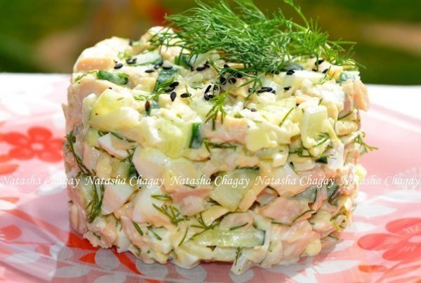 Описание: Салат "Идеал"Салат из кальмаров с сыром очень нежный и вкусный салат. Его можно приготовить как из свежих отваренных кальмаров, так и из консервированных. Вкус у этого морепродукта нейтральный, поэтому он отлично сочетается с разными ингредиентами.Для приготовления салата из кальмаров нам понадобится: сыр твердый 80 г, кальмары (у меня консервированные) 250 г, огурец свежий 1 шт, яйца вареные 2 шт, немного репчатого лука и зелени, майонез, соль и перец по вкусу.Кальмары и огурец порезать небольшими кубиками.Сыр натереть на крупной терке, яйца порезать помельче.Лук и зелень мелко нарезать.Сложить все в миску, посолить, поперчить, заправить майонезом.Закуска готова. Выложить салат в красивую салатницу и за стол. Приятного аппетита!
