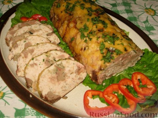 Описание: Куриная запеканкаВкусная запеканка из куриного фарша и куриной печени. Что-то вроде куриной колбасы. Это у меня уже второй вариант. Первую запеканку готовила из печеночного фарша и куриного филе кусочками. Получилось вкусно, но не очень фотогенично. У печенки есть одно неприятное свойство в готовом виде у нее может быть местами зеленоватый оттенок. На вкус это не влияет. Печенка кусочками более стойкая к изменению цвета.ПродуктыКуриный фарш 650 гКуриная печень 350 гЛук 1 шт.Чеснок 2 зубкаЯйцо 1 шт.СольПерец черный молотыйПриправа для курицыЧерствый белый хлеб 2 кусочкаМолоко для замачивания хлеба 150 млМасло для смазывания формыСыр твердый 75 г Как приготовить куриную запеканку:Вместо хлеба я взяла 150г оставшейся пшеничной каши.Печень вымыть, очистить от пленок и порезать кусочками 1,5см. Посолить и поперчить. В фарш добавить мелко порезанный лук, продавленный чеснок, яйцо, замоченный и отжатый хлеб (кашу), соль перец, приправу. Хорошо вымешать. Добавить печень и снова тщательно вымешать. Фарш с печенью должны слиться, чтобы между ними не было пузырьков воздуха.Форму для запекания застелить фольгой, чтобы один край свисал. Смазать маслом (оливковым) и выложить в нее приготовленную смесь. Накрыть фольгой и поставить в духовку, разогретую до 180 С на 1 час.Через час куриную запеканку вынуть, открыть фольгу и перевернуть запеканку на противень. Убрать фольгу, а запеканку посыпать мелко тертым сыром. Поставить куриную запеканку еще в духовку на 20-25 минут.Дать куриной запеканке остыть и нарезать кусочками.Приятного аппетита!
