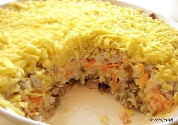 Описание: Ингредиенты:200г маринованных грибов 2 средние луковицы (обжарить) 2 средние картофелины (отварить в "мундире") 1 сырая морковь 300 г любого вареного мяса (можно язык) 250 г твердого сыра майонез и сметана (по вкусу)Приготовление:1. Грибы мелко нарезать, уложить в салатник. Лук нарезать и обжарить на раст. масле, дать остыть и стечь маслу. 2. Уложить на грибы (вообще-то я не люблю в салатах жаренный лук, но в этом рецепте он очень кстати, т.к. грибы не жареные, а маринованные и жаренный лук придает грибам вкус)3. Смазать соусом (сметана+майонез). Картофель очистить, натереть на крупной терке. Смазать соусом4. Морковь натереть на крупной терке, смазать. Мясо нарезать маленькими кусочками и уложить на морковь, смазать соусом. Сверху натереть на крупной терке сыр5. Можно украсить ломтиками лимона и зеленьюОчень вкусный салатик! СОХРАНИ рецепт, чтобы не потерять!!