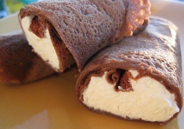 Описание: Шоколадные роллыИнгредиенты:на 10 - 12 порцийДля шоколадных блинчиков:- молоко - 1,5 -2 стакана- яйцо 2 шт- сода 1\2 ч.л- какао - 3 ст.л- мука- растительное масло- сливочное маслоДля начинки:- творог - 400 гр- сметана - 4 ст.л- сахар, ванильный сахар или ванилин на кончике ножа (можно вместо сахара использовать сахарную пудру)Приготовление:1. Молоко подогреем, чтобы оно было теплым, добавим яйца, соду, 1\3 стакана растительного масла, все перемешаем , добавим какао и вновь перемешаем. После чего вводим тонкой струйкой муку. Тесто должно быть по консистенции, как сметан.Выпекаем блинчики диаметром 20 - 24 см, каждый готовый смазывая сливочным маслом.2. Творог смешиваем со сметаной, сахаром и ванилином стараемся так смешать, чтобы не было крупинок творога, а получилась однородная масса.3. Берем готовый блинчик, обильно смазываем его творожной начинкой и скручиваем трубочкой, таким способом делаем остальные блинчики. Складываем на тарелку и отправляем в холодильник, примерно часа на час, чтобы творожная начинка схватилась.4. Затем достаем, нарезаем небольшими столбиками. На тарелку , в которой будем подавать, кладем густой сметанный соус, соус из замороженных ягод перетертых с сахарной пудрой, варенье, джем фруктовый - кто что предпочитает и устанавливаем наши роллы.