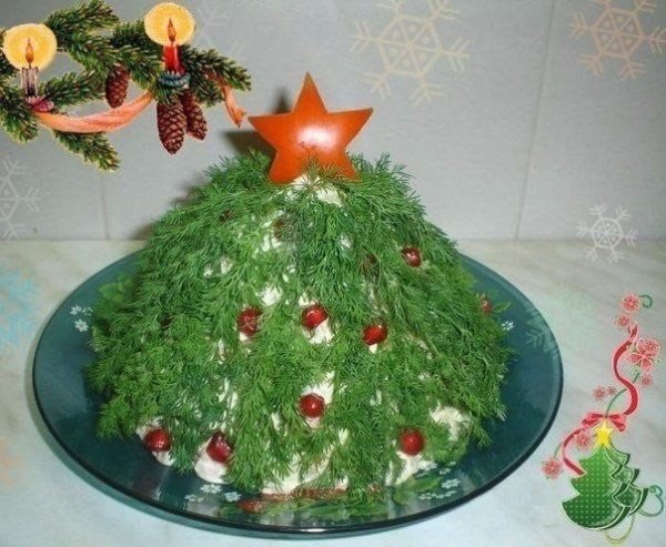 Описание: Салат "Новогодняя ёлочка"Ингредиенты:-свекла 2шт.;-крупная морковь 1 шт.;-картофель -5шт.;-лук (репчатый или зеленый по желанию);-майонез;Для украшения:-укроп;-консервированная кукуруза;-клюква (гранат);-яйцо.Приготовление:1. Овощи отварить и остудить, очистив, натереть на средней терке (из одной дольки морковки вырезать для украшения звездочку). Стоит отметить, что для праздничного варианта данного блюда картошку можно заменить кислым яблоком.2. Селедку разделать, освободить от костей, нарезать мелкими кусочками.3. Теперь на широкое красивое блюдо выкладываем слои (толщиной примерно в 1 см) в форме елочки:- Картофель, сдобренный майонезом;- сельдь с луком тонкий слой майонеза;- морковь;- свеклу обильно покрываем майонезом и аккуратно размазываем.4. Принимаемся за украшение нашей новогодней красавицы выкладываем веточки укропа по подобию настоящих веток. В вершину елки укладываем морковную звезду. Вареное яйцо натираем на мелкой терке (желток отдельно от белка). Натертую белковую массу выкладываем как основу будущей гирлянды. Саму гирлянду формируем из зерен кукурузы. Также выкладываем натертый желток - основой другой гирлянды, в роли которой выступят ягоды клюквы.Аппетитный праздничный салат готов! Вряд ли кто-нибудь откажется от такого нарядного лакомства:ням