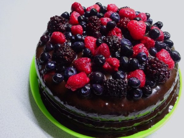 Описание: очень простой в приготовление,нереально вкусный и нежный,таящий во рту шоколадный тортик.200г муки(у меня кукурузная),1 ч.л. соды,пол ч.л. соли,200г сахара(или сахаразаменитель по вкусу),40г какао.перемешиваем венчиком.добавляем 2 яйца,40г растопленного слив масла,40 мл олив.масла,ванилин,200-240 мл молока и 1 ст.л. винного уксуса не больше 6%. если нету,можно заменить на лимонный сок,но не знаю получится ли с ним так же вкусно).все мешаем венчиком,берем высокую форму для запекания,смазываем маслом и выливаем тесто. я готовила в мультиварке 30 мин. в духовке где то 30-50 мин 180 градусов. протыкать шпажкой,она должна быть сухая. хорошо выходит из формы. я обычно прикладываю большую тарелку или кладу сверху доску и переворачиваю. разделяем на 2 части и даем остыть 2 коржам.дальше подобие ганаша).у меня сливок не было,так что я импровизировала.150 мл молока жирного,80г слив масла,200г черного шоколада,крахмал,какао. молоко нагреть и растопить в нем масло,вмешать какао.шоколад мелко разломать и всыпать в молочную смесь,постоянно помешивать венчиком на среднем огне,добавить 2-3 ст.л. крахмала. как шоколад растает,убрать его с плиты.должно загустеть,если не загустеет,всыпать еще крахмала,на крайняк можно муки,но не переборщите с ней,а то будет тесто уже по вкусу)между коржами промазать "ганашем" и полить половником сверху начиная с центра,что бы шоколад аккуратно растекался со всех сторон. украсила замороженными ягодами.черника,ежевика и малина.