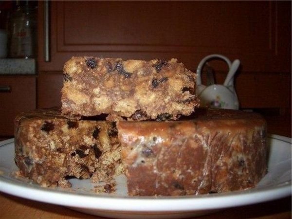 Описание: Тортик без выпечкиИнгредиенты:Печенье (у меня "к кофе") 24 шт. +на обсыпкуТворог 250 гСметана 5 ст. л.Сахарная пудра 3 ст. л.Масло сливочное размягченное 100 гЧернослив по вкусуКакао для украшенияКофе (уже готовый) немного (по желанию)Приготовление:1. Творог перемешать с сах. пудрой и сметаной (можно миксером на низкой скорости, я толкушкой с дырками мяла). Добавить масло. Чернослив распарить, порезать.2. Форму подходящую выстелить пленкой, выложить слой печенья (слой 3 на 2, можно больше, у меня 4 слоя). 3. Можно печенье обмакнуть быстро в кофе или полить слегка. Смазать творожной начинкой, выложить чернослив. Опять слой печенья, сбрызнуть кофе, творожная начинка, чернослив, повторить. Последний слой печенья можно смазать тонко, а можно нет. Я слегка смазала, чернослив не выкладывала. 4. Осторожно перевернуть на блюдо, снять пленку, обмазать кремом верх и бока. Посыпать верх какао и бока крошкой от печенья.5. Дать пропитаться. Нам хватило двух часов. Очень мягкий и вкусный