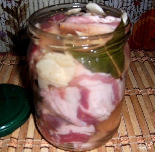 Описание: Маринованное сало счеснокомВремя приготовления: 3дн. 23 ч. 0 минКоличество порций: 5 -10Ингредиенты:Сало свежее — 500ГраммВода — 400 МиллилитрКаменная соль — 35ГраммУксус 9% — 25МиллилитрСмесь перцев — 1Чайная ложка (чёрный/красный/белый)Горчица сухая — 1Щепотка (в зернах)Перец горошком — 5 - 6Штук (душистый ичёрный)Лавровый лист — 3ШтукЧеснок — 4 ЗубчикХмели-сунели — 0 ПовкусуПриготовление:1. 1. Вскипятите воду,бросьте в нее сольи все специи,перемешайте дорастворения соли.Уксус влейте послетого, как маринадбудет готов,следом бросьте ичеснок,очищенный инарезанныйпластинами.Готовый маринадполностьюохладите.2. 2. Сало промойте ипросушите отлишней влаги спомощьюбумажныхполотенец. Банкудля маринованияхорошо вымойте ипростерилизуйте.3. 3. Нарежьте салона куски среднегоразмера(приблизительно5х4 см.). Уложитепорезанное сало вбаночку, но неслишком плотно.4. 4. Залейте маринадтак, чтобы онполностью покрылсало. Плотнозакройте крышкойили закатайте.Через 5 днеймаринованное салос чесноком будетполностью готовок употреблению.