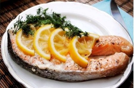 Описание: Ингредиенты Стейк лосося - 1 шт. Лимон - несколько долек Приправы (перец, сушеный базилик) Соль Фольга для запекания Способ приготовленияСтейк лосося моем, солим с двух сторон, посыпаем специями, выкладываем сверху дольки лимона. Противень застилаем фольгой и выкладываем стейк. Фольгу заворачиваем, чтобы получился конверт . Ставим в разогретую до 180-200С духовку на 20-25 минут. Приятного аппетита!