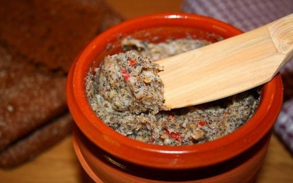 Описание: Обалденно вкусно!!! Намазка для бутербродов из сала, чеснока, зелени и орехов!!!Сальная намазка — очень вкусная деликатесная закускаВкус необыкновенный, я ничего подобного раньше не пробовала! Готовится предельно просто. Получается очень вкусная бутербродная масса, которую можно просто намазать на кусочек свежего черного хлеба и подать как дополнение к горячему борщу. Впрочем, и для обычного перекуса такой бутерброд будет весьма недурен. К охлаждённой водочке, да на чёрном хлебушке... просто идеально! А если к салу, перекрученному с чесноком , добавить перец чили, грецкие орехи, мак — получите настоящее гастрономическое удовольствие... М-м-м.соленое сало ( можно брать свежее, но тогда его нужно выдержать сутки в морозилке) — 500гчеснок 5 зубчиковзелень ( по вкусу) у меня свежий тимьян , брала только листикиперчик чили ( по вкусу можно брать любой) у меня 3 штгрецкие орехи 0,7 стмак 0,5 стЧеснок очистить. Чили освободить от семян и перегородок . Орехи и мак прокалить на сковороде по отдельности. Мак перемолоть в мельчителе . Листики тимьяна отделить от веточек .На мясорубке прокрутить два раза сало, перец чили, чеснок, тимьян и орехи. Добавить к массе перемолотый мак. Тщательно перемешать. Хранить в холодильнике. Я брала соленое сало, поэтому мне не понадобилось дополнительной соли, используя менее соленое или не соленое сало, конечно, нужно добавить соли.Можно есть с черным ржаным хлебом, горбушками, тостами.