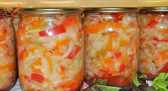 Описание: САЛАТ ИЗ КАПУСТЫпонадобится:Капуста – 5 кг;Морковь – 1 кг;Лук – 1 кг;Перец – 1 кг;Подсолнечное масло – 0,5 л;Вода – 2 стак;Сахар – 250 г;Соль – 4 ст. л;Уксусная эссенция – 6 ч. л.Капусту, моем, очищаем от верхних листьев, если необходимо, мелко шинкуем. Морковь, моем, чистим, трем на крупной терке. Лук, моем, чистим, нарезаем полукольцами или четвертинками. Перец моем, очищаем от семян и режем на небольшие кусочки.В кастрюле смешиваем масло и воду, кипятим. Овощи смешиваем с солью, сахаром, уксусом, заливаем водой с маслом. Помещаем под груз на сутки. Раскладываем по банкам, для длительного хранения стерилизуем 10-15 минут и закатываем. Можно хранить просто в холодильнике без стерилизации и закатывания.