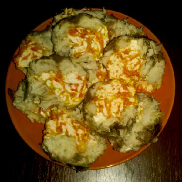 Описание: Рулет из скумбрии.Готовила второй раз.В этот раз рыбку разрезала со стороны животика(в прошлый-по спинке).В качестве начинки сырая морковь и плавленные сырочки(все на крупной терке).Результат отличается от первого.Рулет резался не очень хорошо.Похоже,изначально рыба была немного переморожена.Рыбная часть не очень плотная(в прошлый раз плотнее).Но все равно вкусно.Рулет мне понравился.Рыбку почистила,отрезала плавники,голову,хвост.Промыла,немного обсушила бумажным полотенцем.Достала хребет и оставшиеся косточки.Чуток посолила,посыпала приправкой для рыбы,немного желатина,выложила начинку(плавленный сырок,морковь,желатин),свернула рулетом,замотала в фольгу,потом поочередно в два целлофановых кулька,максимально выпуская воздух.Варила под крышкой минут 50-55.Достала,остудила на дуршлаке.Развернула,замотала в фольгу,отправила в холодильник.