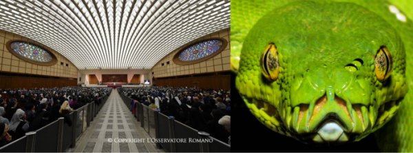 Описание: А теперь подумайте об этом на мгновение: если всё здание напоминает голову змеи, это будет гораздо труднее игнорировать. Надо начинать понимать, что это было все спроектировано и построено специально.Реальность такова, что для этой картины есть очевидная причина.Вы можете спросить, что это за причина; почему это здание было построено таким образом, что Папа, кажется, говорит из уст рептилии? Если вы не задаёте этот вопрос, вы просто закрываете глаза. Дело не в том, что доказательств нет, а в том, что вы решили не видеть этого. Есть семь отдельных частей, которые содержат символ змеи или рептилии. Если бы это был один или два, я бы поняла ваш скептицизм даже три. Но когда семь штук собираются вместе, так красиво, так прекрасно, вы знаете без тени сомнения, что это было сделано намеренно.