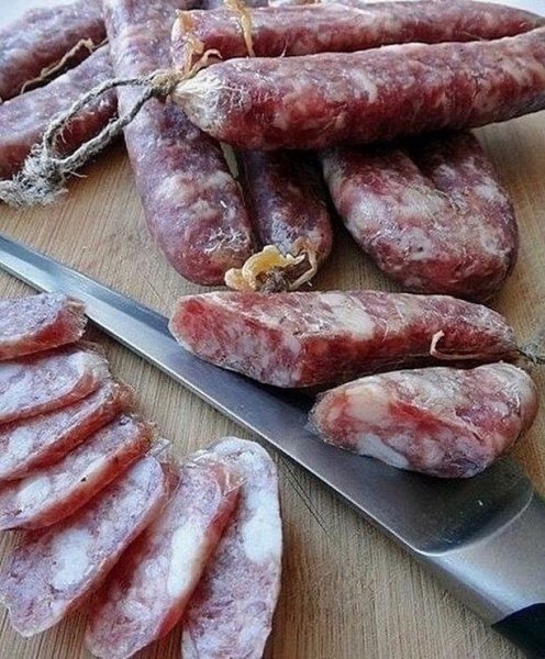 Описание: - Фарш мясной (свиной) 3 кг- Чеснок (головка) 4 шт- Перец красный жгучий (молотый)- Майоран- Спирт (96%) 3 ст. л.- Соль 85 гНа 1 кг фарша примерно 28 г. соли (это очень важно).Итак: 3 кг мяса перекрутить на колбасную сетку, добавить 84 -85 г. соли, через мясорубку (мелкую сетку) перекрутить 4 головки чищенного чеснока, поперчить чёрным перцем, красным сладким и красным острым. Всё тщательно перемешать и оставить минимум на 5 часов, периодически перемешивая, чтобы соль, чеснок и перцы распределились по всему мясу.Как пройдeт 5 часов, из этого фарша жарим одну маленькую котлетку, для того, чтобы понять, чего не хватает, но пробовать нужно в холодном виде, в горячем всего много получается, это нужно учестьЕсли в котлете всего достаточно, то в фарш добавляем майоран и три столовые ложки спирта 96 % (спирт даeт мясу красноту), обратно всё тщательно перемешиваем и начинаеа напихивать мясо в кишочки. В мясорубку вкручиваем трубочку для кишок и надеваеа на эту трубочку кишку, завязываем ниткой один конец и начинаем наполнять. Когда всё сделано, т. е. колбаски готовы, то прокалываем их в некоторых местах иголкой, чтоб ушёл воздух.Сутки провисит, снимаем и нежными движениями скалкой катаеа колбаски так, чтоб они приобрели немного сплюснутый вид, это придаёт им красивый вид, затем снова вешаем и минимум через неделю можно пробовать, должно высохнуть.Приятного аппетита!!!