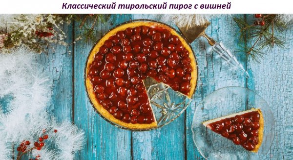 Описание: Классический тирольский пирог с вишнейДесерты и выпечка / Австрийская кухняЭтот десерт подойдёт как для завтрака, так и для застолья. Вкуснейшая начинка из крема и ягод никого не оставит равнодушным.Ингредиенты для теста* Сливочное масло - 200 г* Сахар - 200 г* Яйцо - 1 штука* Мука - 200–280 гИнгредиенты для начинки* Вишня - 300 г* Желатин - 1 ст. ложка* Сахар - 4 ст. ложкиИнгредиенты для крема* Яичный желток - 3 штуки* Сахарная пудра - 100 г* Мука - 1 ст. ложка* Крахмал - 1 ст. ложка* Молоко - 400 млПриготовление1 - Сливочное масло разотрите с сахаром до однородности, введите яйцо, муку и замесите эластичное тесто. Заверните массу в пищевую плёнку и уберите в холодильник на 30 минут.2 - Остывшее тесто раскатайте, переложите в форму, смазанную маслом, и выпекайте 15 минут при температуре 220 °C.** Чтобы бортики не опали в духовке, можно предварительно придавить тесто в форме грузом и убрать в холодильник ещё на 10 минут.3 - Пока тесто остывает, приготовьте крем и начинку. Удалите косточки из вишни, пересыпьте ягоды сахаром и отставьте, чтобы они выделили сок.4 - Для крема взбейте венчиком желтки и сахарную пудру, введите обжаренную до золотистого цвета муку, крахмал и взбейте смесь до однородности.5 - В кастрюле подогрейте стакан молока, добавьте крем, перемешайте, влейте оставшееся молоко и доведите до кипения, постоянно помешивая.6 - Как только крем начнёт густеть, снимите его с огня и охладите до комнатной температуры. Переложите крем на остывшую основу из теста и уберите в холодильник на 30 минут.7 - Затем украсьте пирог обсушенными вишнями и полейте смесью из выделившегося вишнёвого сока и желатина, разведённого в 100 мл воды.8 - Уберите десерт в холодильник, чтобы желе застыло, — через пару часов классический тирольский пирог будет готов.