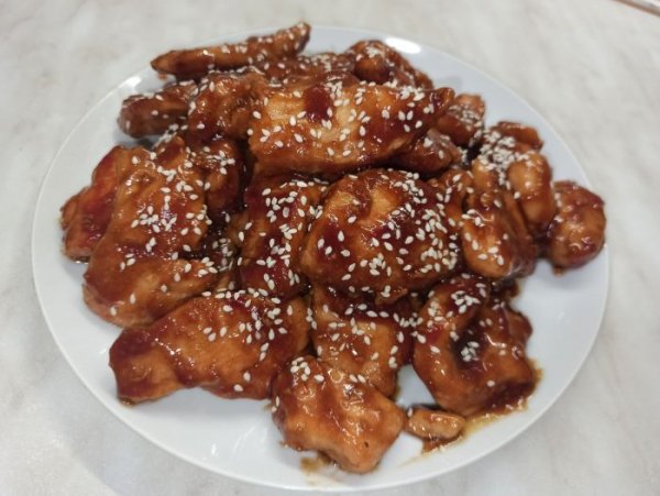 Описание: Ингредиенты :Куриное филе - 1 кгСоевый соус - 100 млВода - 100 млСахар - 60 гМед - 1 ст.лЯблочный уксус - 1 ст.лЧеснок сушеный - 2 ч.лИмбирь молотый - 2 ч.лКрахмал картофельный - 3 ч.лРастительное масло - 1 ч.л в соус + для жаркиКунжут по желанию для украшенияСольСпособ приготовления:1.Для соуса: соединяем соевый соус,сахар,мед,яблочный уксус,гранулированный чеснок,имбирь молотый,растительное масло.Отдельно соединяем воду и крахмал,перемешиваем и добавляем к соусу.Все еще раз хорошо перемешиваем.2.Куриное филе тщательно промываем, обтираем бумажными полотенцами чтобы не осталось лишней влаги. Нарезаем филе величиной примерно в 3 см.Курицу солим и перемешиваем.3.Ставим сковороду на плиту, наливаем растительное масло, разогреваем. Кладём куриное филе и обжариваем с двух сторон до румяности ,около 3 минут с каждой стороны. Затем вливаем в курицу соус терияки и при постоянном помешивании жарим до тех пор пока соус не загустеет. За это время кусочки курицы покроются аппетитной карамельной корочкой.Курица в соусе Терияки готова! Сверху по желанию можно присыпать кунжутом.Подавайте к столу с рисом или овощами и наслаждайтесь невероятно вкусным и доступным блюдом для каждого!