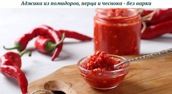 Описание: Аджика из помидоров, перца и чеснока - без варкиЗаготовки впрок / Соус / Кавказская кухняЭтот острый сырой соус может храниться в холодильнике всю зиму.• Помидоры - 1 кг• Красные болгарские перцы - 500 г• Красные острые перцы - 100–150 г• Чеснок - 100 г• Соль - 1 ст. ложка1 - Измельчите все овощи через мясорубку. Добавьте соль и всё тщательно перемешайте.*** Вес ингредиентов указан в очищенном виде.2 - Накройте крышкой и оставьте на сутки при комнатной температуре. За это время несколько раз перемешайте.*** После настаивания на поверхности аджики не должно остаться пенки.3 - Разложите сырую аджику по стерилизованным банкам и плотно закройте. Храните в холодильнике.