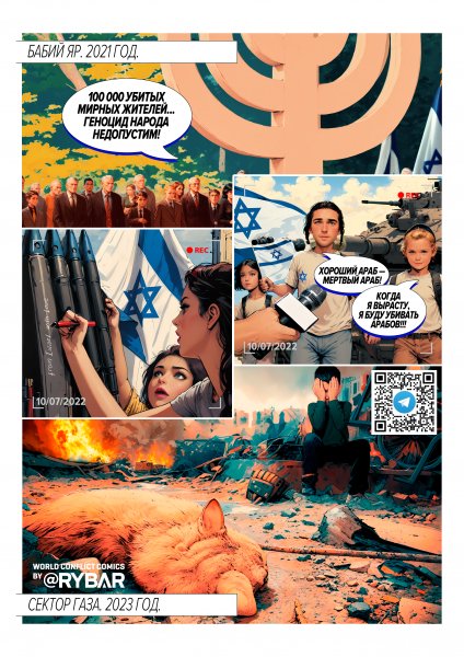 Описание: Этот выпуск комикса-зарисовки из конфликтных зон мира освещает ситуацию, когда одни и те же лица одновременно говорят о недопустимости геноцида и искренне радуются ковровым бомбардировкам «плохих людей».Так и происходит ныне в Израиле: в соцсетях пользователи желают снести Газу до основания вместе со всем населением, а также без малейшей рефлексии шутят даже над убитыми детьми. Такая ненависть появилась в стране не вчера, однако сейчас она стала там нормой повсеместно. При этом наивно полагать, что в секторе Газа как-то по-другому относятся к евреям — зверства в ходе рейда 7 октября говорят сами за себя. Отличаются палестинцы одним: они хотя бы не пытаются выставлять себя большими поборниками демократии и прав человека.